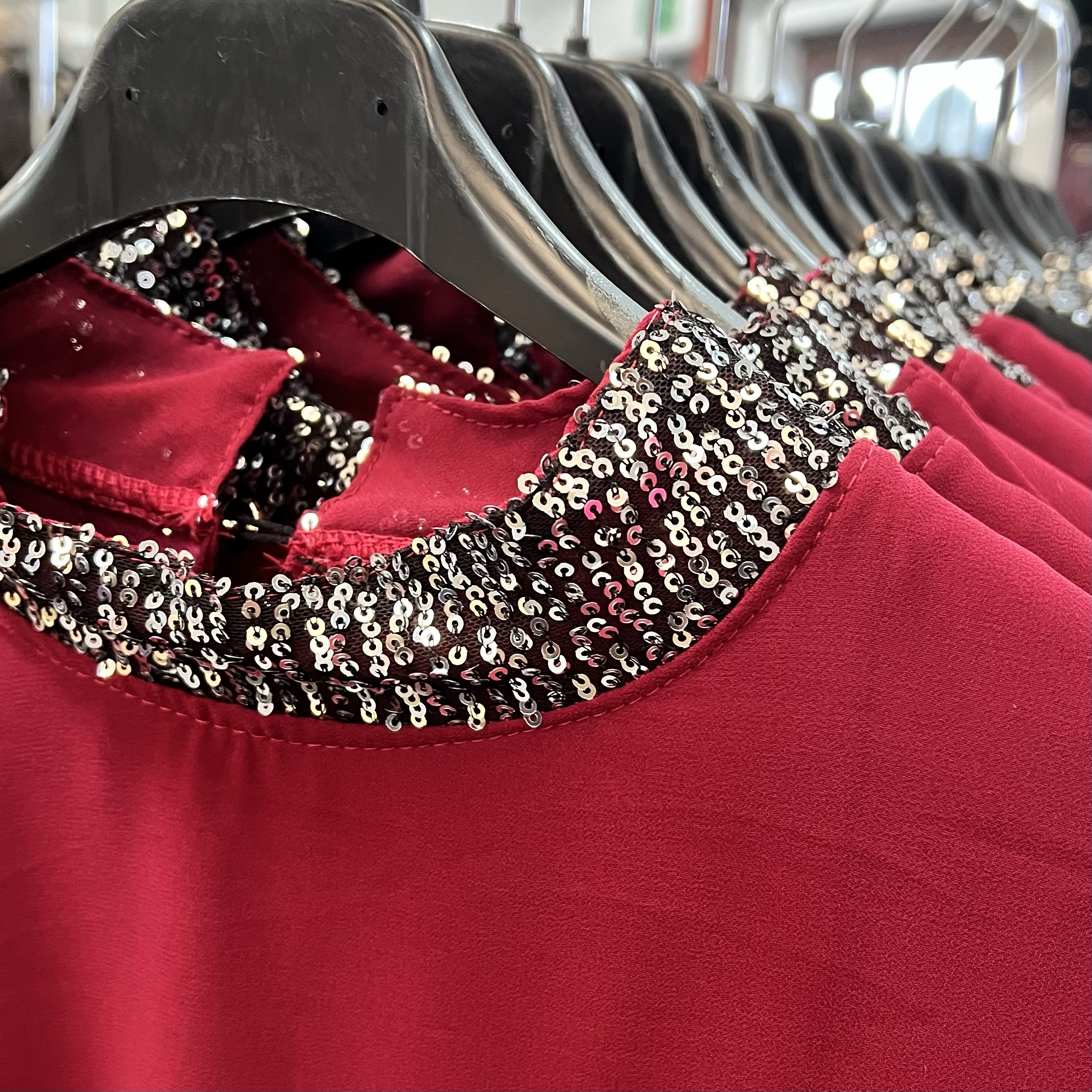 £28.00 Colour Choose an optionRedBlackClear Sequin Evening Blouse quantity Add to cart SKU: N/A Category: Clothing Description Additional information Description Stunning Oversized box cut evening blouse with sequin round neck collar and cuff. One Size to 18 Additional information Colour Red, Black Related products Fleck Pocket Top £20.00 Select options This product has multiple variants. The options may be chosen on the product page Batwing Rib Jumper £28.00 Select options This product has multiple variants. The options may be chosen on the product page Two Layered Top With Necklace £22.00 Select options This product has multiple variants. The options may be chosen on the product page Smart Pull On Trousers £18.00 Select options This product has multiple variants. The options may be chosen on the product page