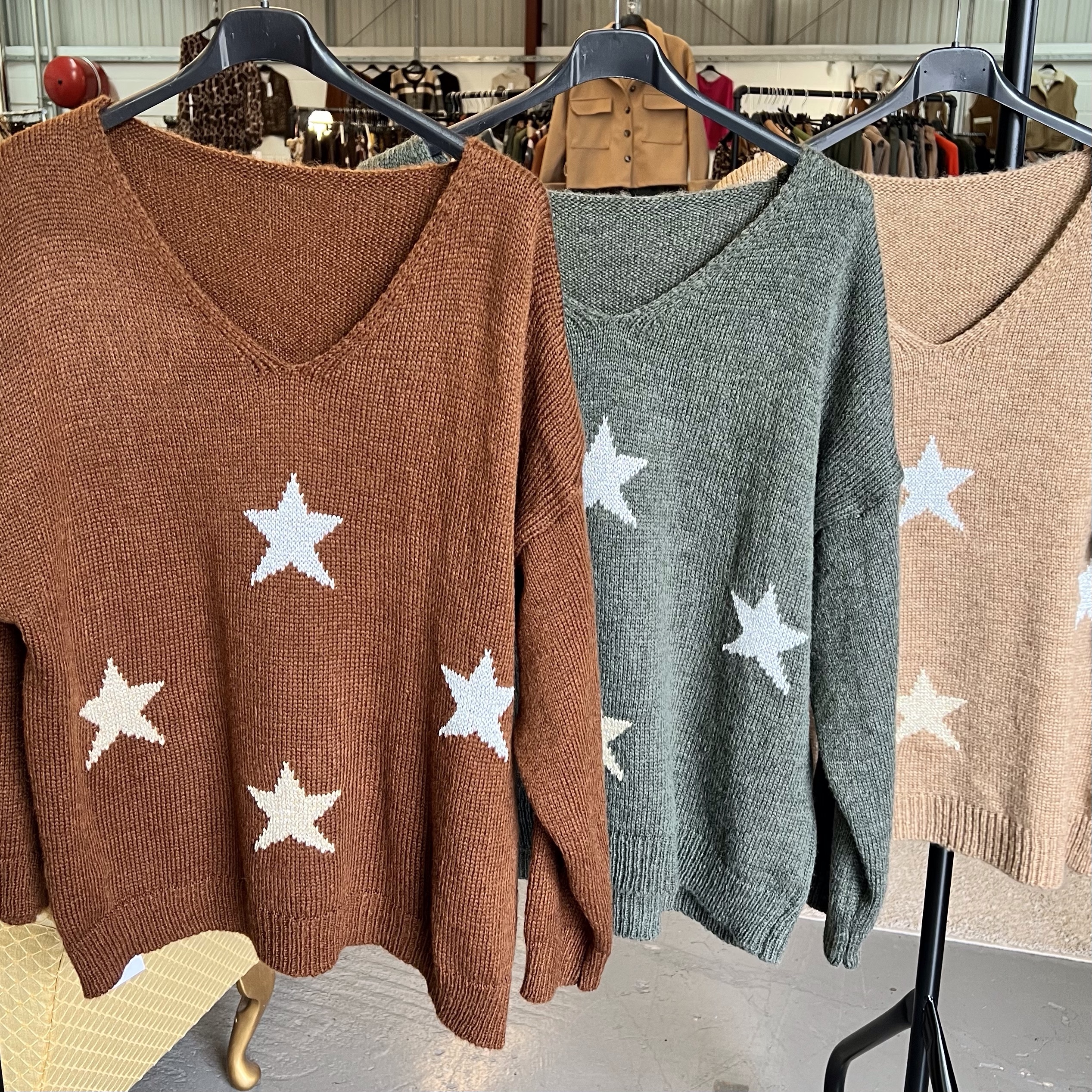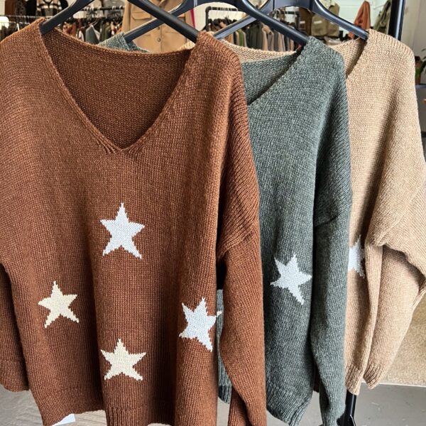 Gorgeous flattering v neck jumper with sparkly gold and silver stars.